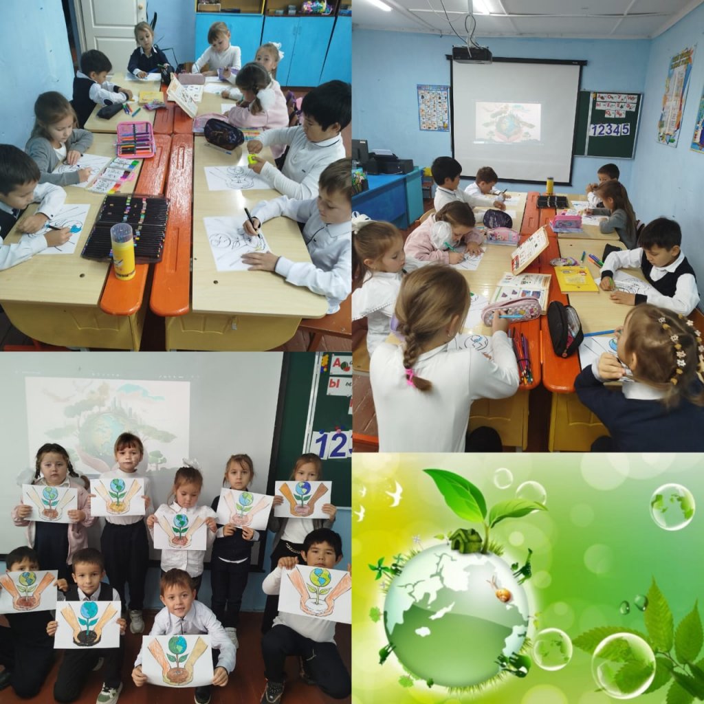 Тақырыбы: «Экология – бізді қоршап тұрғанның бәрі». Міндеттері: Оқушыларды «экология» және «экологиялық қауіпсіздік» терминдерімен таныстыру; салыстыруға, талдауға, жалпылауға үйрету; балаларға Жер – біздің үйіміз екенін көрсету: өз үйімізді күту – денсаулығымызды күту; қоршаған ортаға қамқорлықпен қарауға және жеке экологиялық қауіпсіздік ережелерін сақтауға тәрбиелеу.